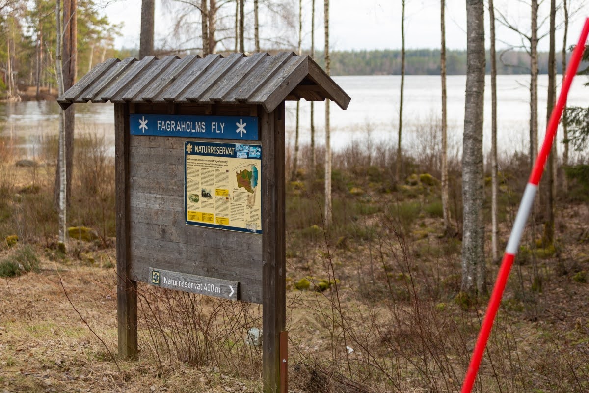 Folgt man der Straße zwischen Åseda und Växjö etwa 6 Kilometer, ist das Naturreservat Fagraholms fly ausgeschildert, man parkt direkt in der großen Parkbucht an der Straße 23. Hier gibt es ein paar Picknicktische am See Sjöatorpasjön, eine Infotafel und Mülltonnen. Am Parkplatz beginnt dann auch der Wanderpfad ins Naturreservat, dem man etwa 400 Meter am Seeufer entlang folgt.