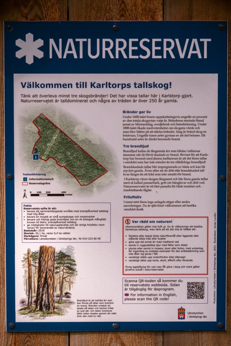 Ein wunderschönes, aber absolut unbekanntes Naturreservat befindet sich westlich von Karlstorp, Vetlanda kommun. Seit 2019 steht der Kiefernwald von Karlstorp unter Schutz, es gibt keinerlei Wege und keine Zufahrt zum Reservat, es ist auch nicht ausgeschildert.