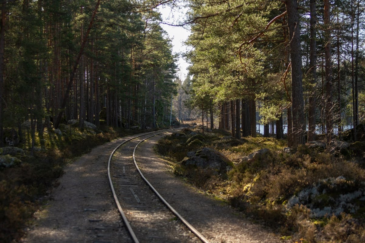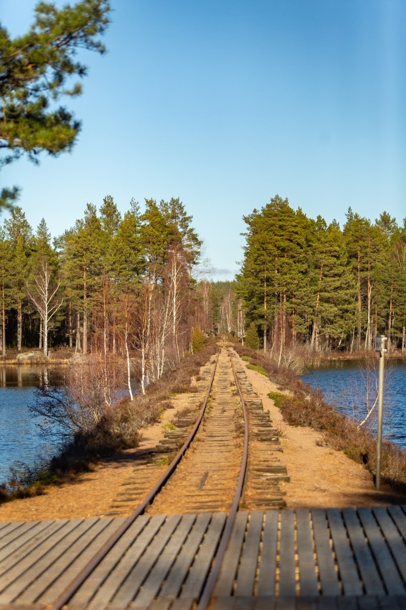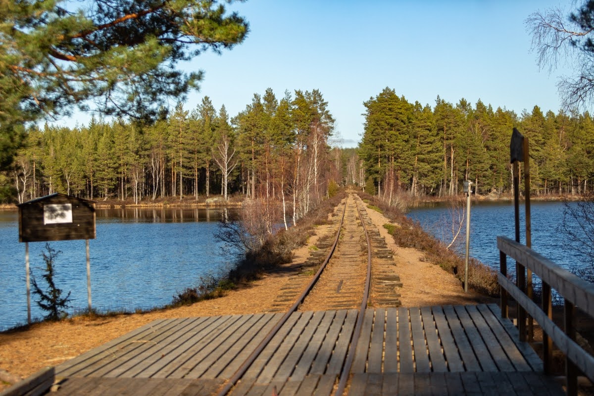 Mitten durch den See verläuft über einem Damm die ehemalige Bahnlinie zwischen Växjö und Västervik, die heute nur noch ab und zu im Sommer als Museumsbahn durch die Wälder rollt. Ansonsten werden die Schienen von Touristen mit Draisinen genutzt, die man an verschiedenen Orten in der Umgebung, z.B. in Virserum, mieten kann. Direkt am Wanderweg gibt es einen Haltepunkt mit Rastplatz, hier stehen Tische, Bänke, Grillplatz und Toiletten zur Verfügung.