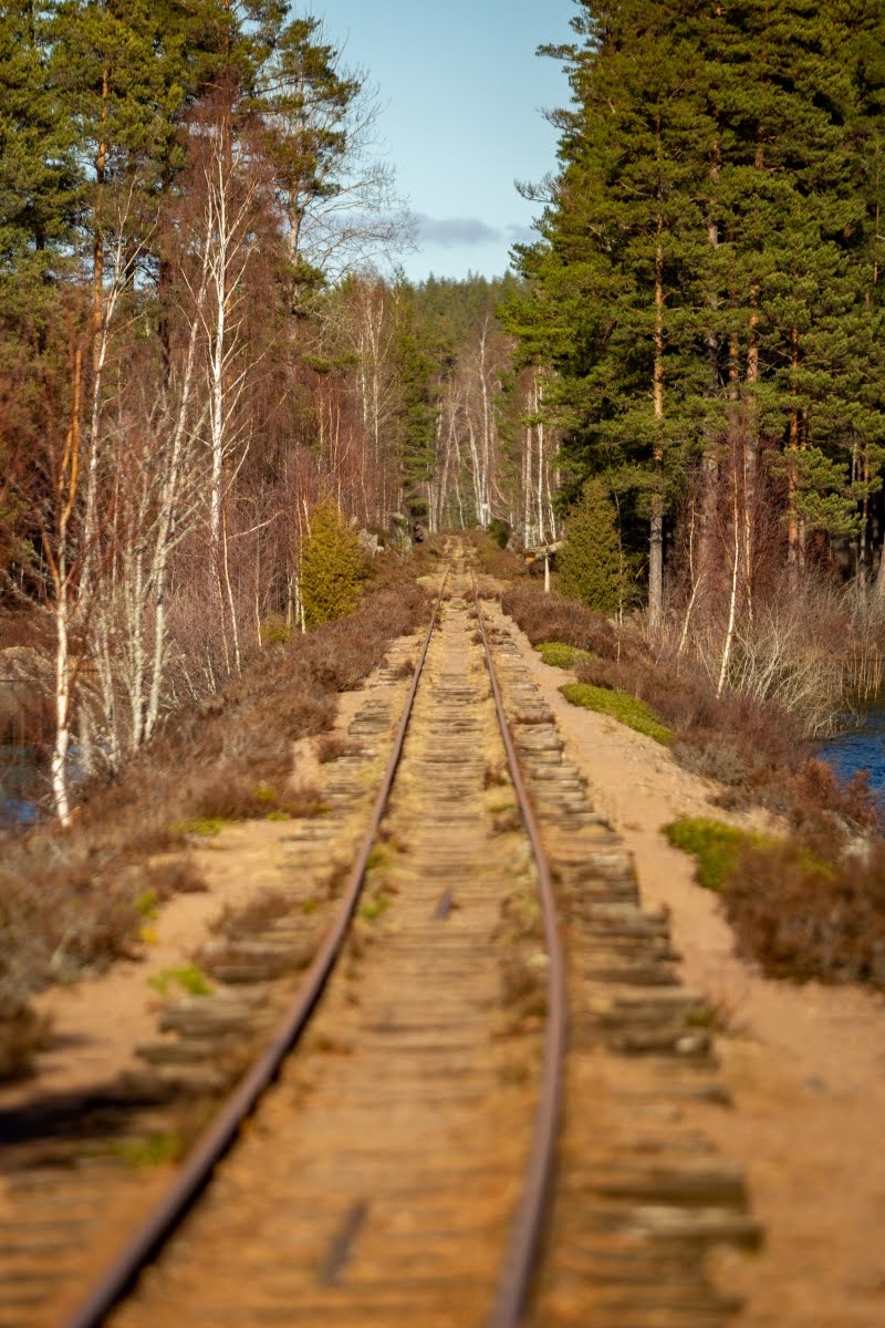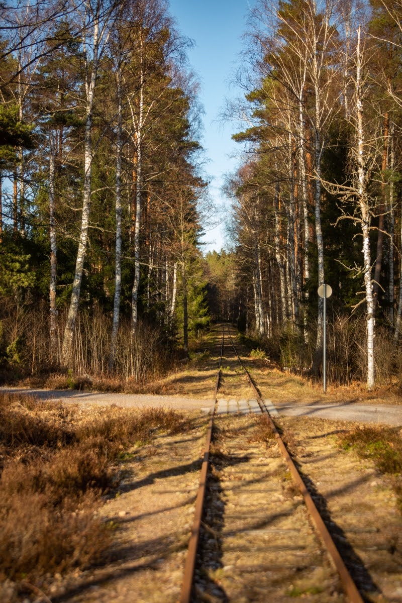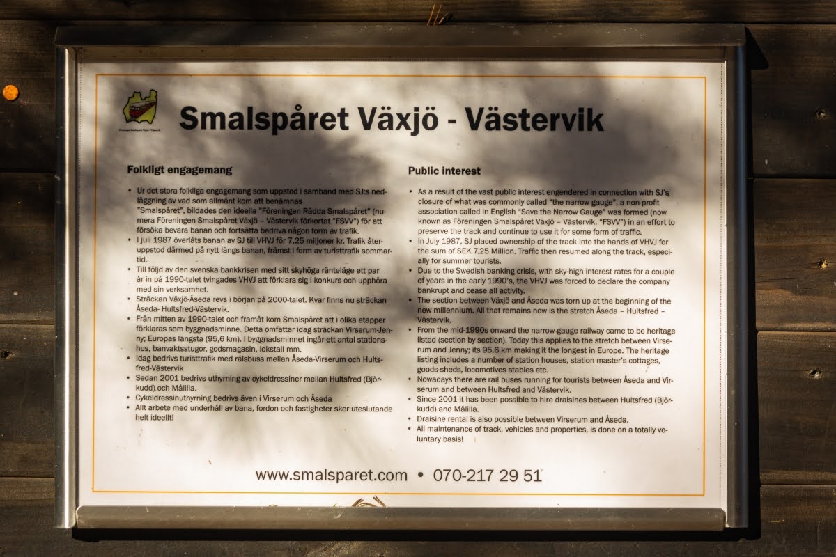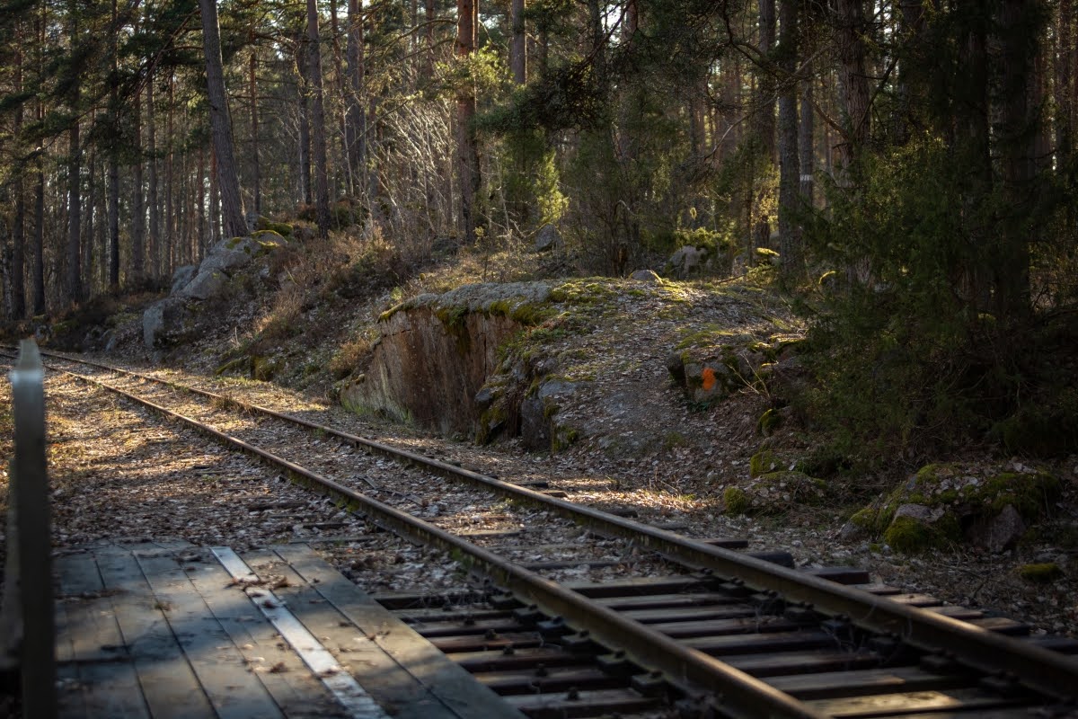 Mitten durch den See verläuft über einem Damm die ehemalige Bahnlinie zwischen Växjö und Västervik, die heute nur noch ab und zu im Sommer als Museumsbahn durch die Wälder rollt. Ansonsten werden die Schienen von Touristen mit Draisinen genutzt, die man an verschiedenen Orten in der Umgebung, z.B. in Virserum, mieten kann. Direkt am Wanderweg gibt es einen Haltepunkt mit Rastplatz, hier stehen Tische, Bänke, Grillplatz und Toiletten zur Verfügung.